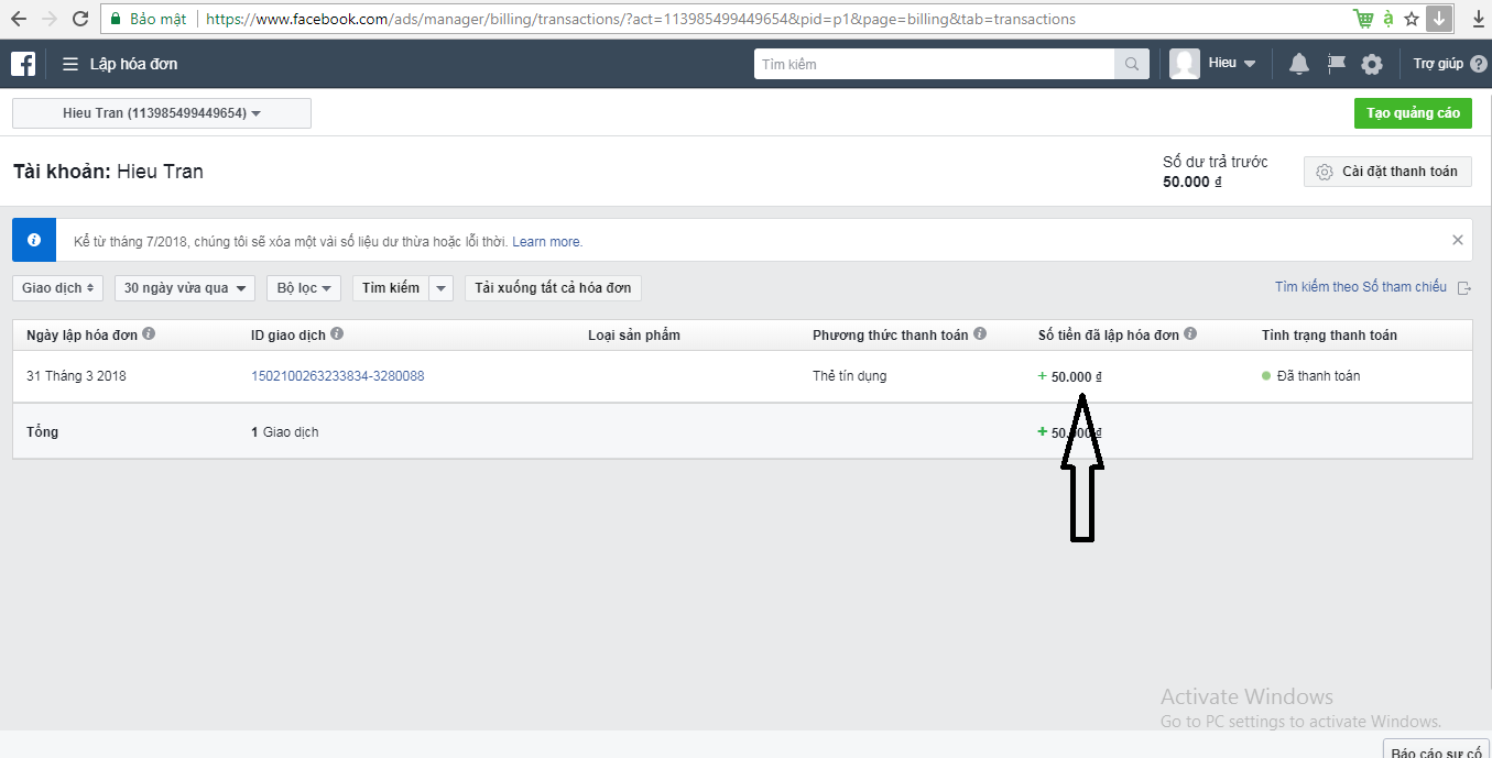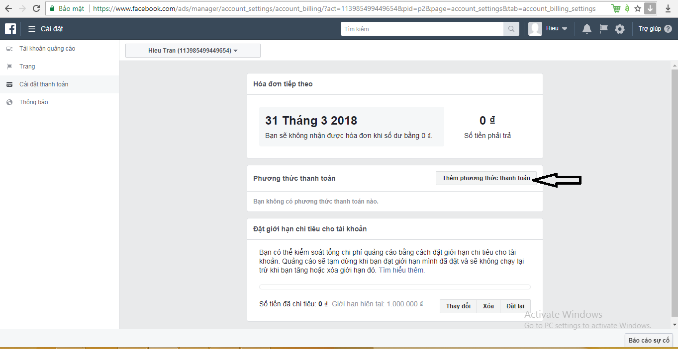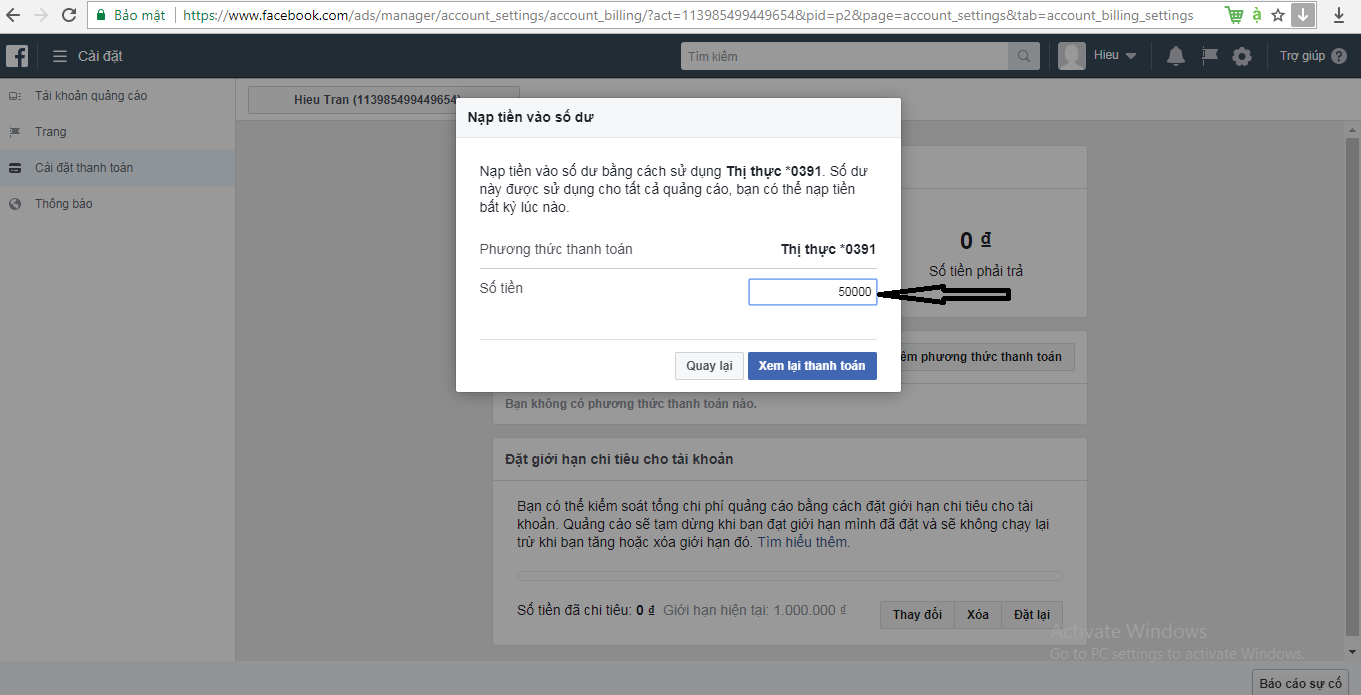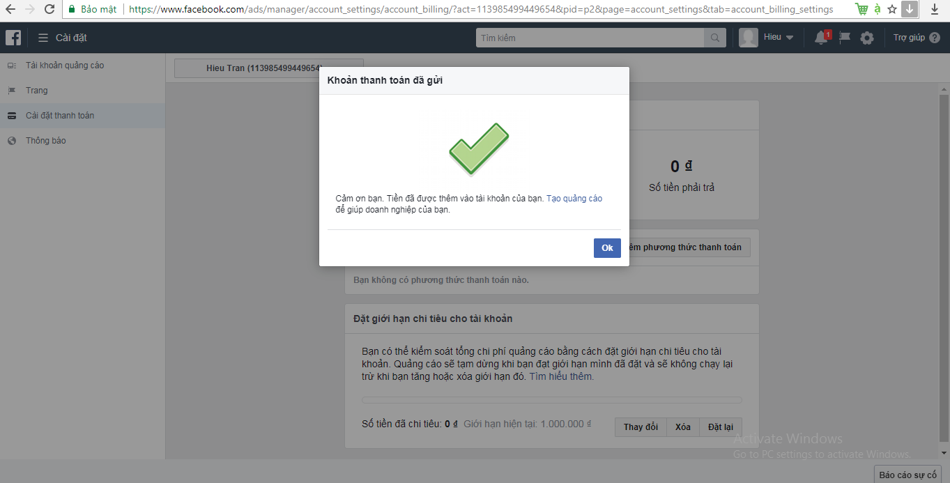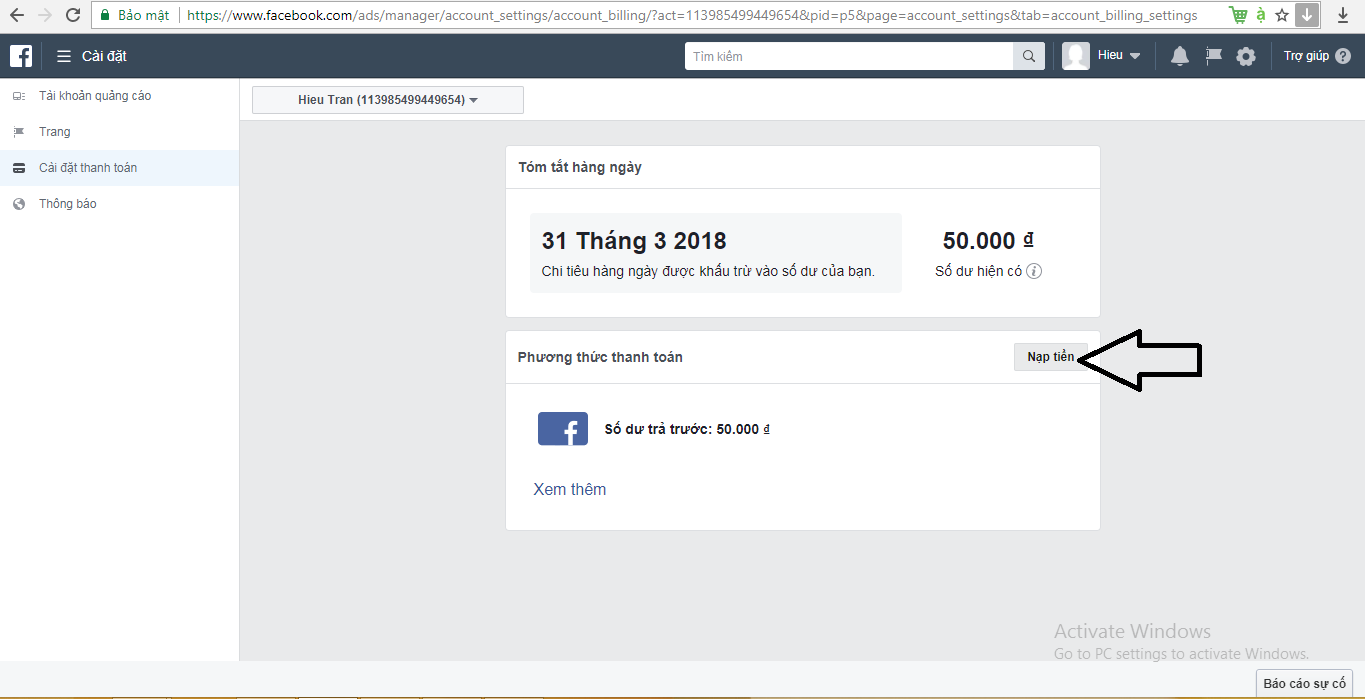 Bước 4 : Nạp tiền cho các lần sau cần Ngân sách quảng cáo
