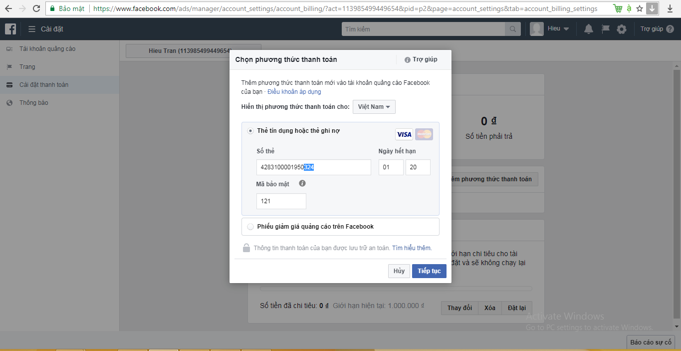 Bước 2 : Nhấn vào nút Thêm Phương thức thanh toán , bạn thêm thông tin thẻ Visa/ Mastercard của bạn ; Đảm bảo thẻ Visa phải nạp tiền tối thiểu 50.000 đồng ( số tiền trong thẻ phải lớn hơn ngân sách bạn chạy quảng cáo).