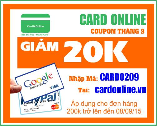 GIẢM NGAY 20.000Đ cho khách hàng mua thẻ Visa/Master tại website cardonline.vn và nhập mã "CARD0209" với đơn hàng trị